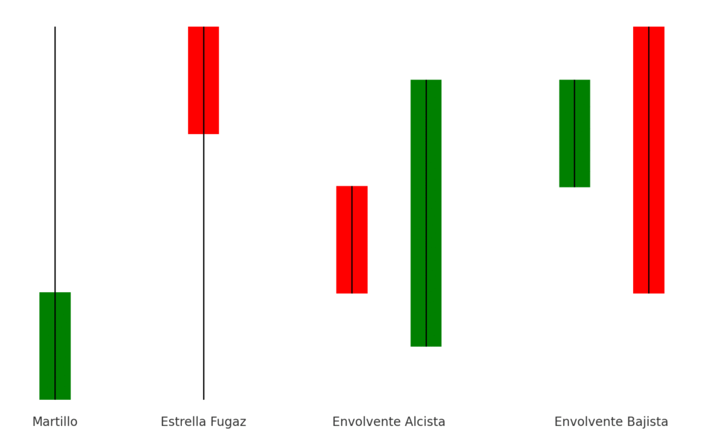 - Estrella fugaz: Ocurre tras una tendencia alcista. Tiene una mecha superior larga y cuerpo pequeño. Suele anticipar una caída en los precios.